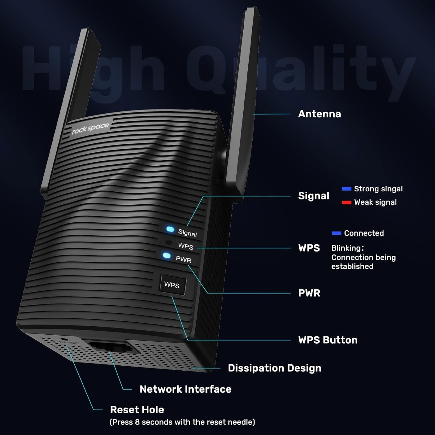 - Super High Speed & Stable Signal: rockspace WiFi range extender come with latest dual band technology (300Mbps for 2.4GHz, 867Mbps for 5GHz), higher penetration with 2.4GHz band,creating high-speed network by using 5GHz band, best choise for smart home, transfer large digital files, HD videos and online games
